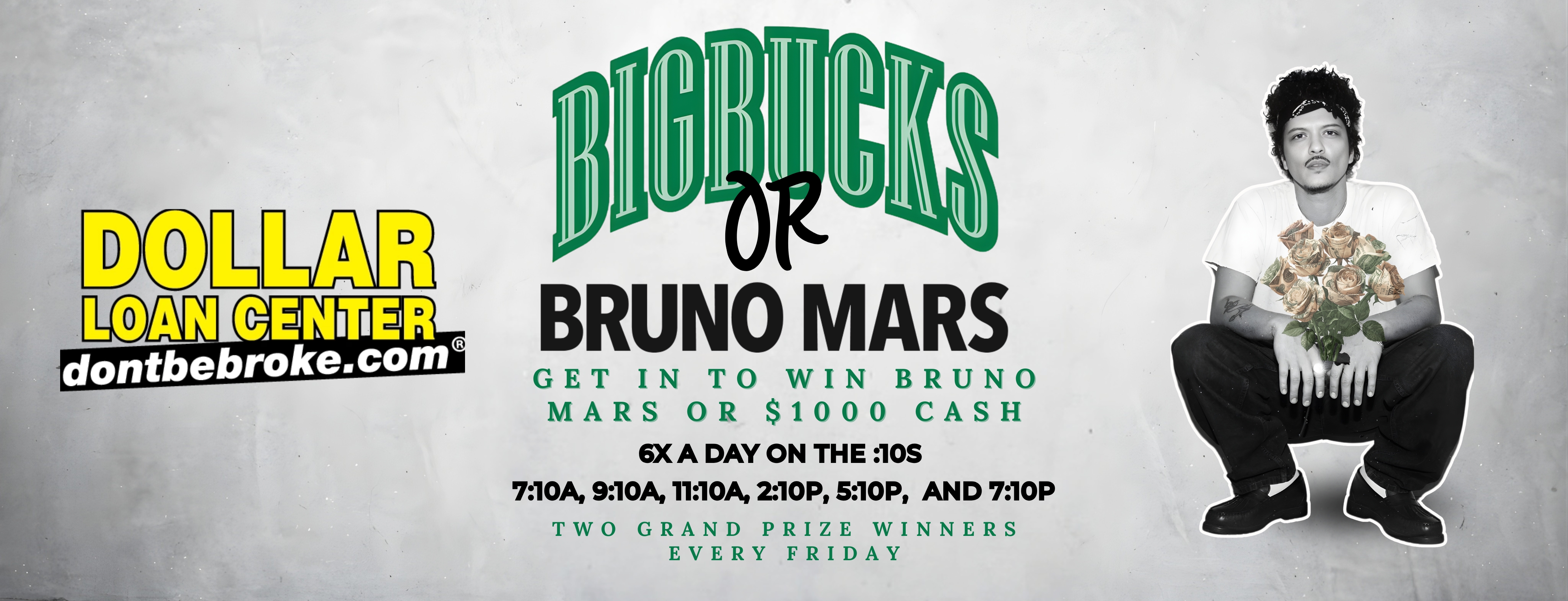 Dollar Loan Center presents BIG BUCKS OR BRUNO MARS. Be sure to tune in to Hot 97.5 weekdays to get in to win DAILY--6x a Day on the :10s --7:10a, 9:10a, 11:10a, 2:10p, 5:10p and 7:10p. Once you win, get automatically hooked up with $200 CASH PLUS you'll be in for one of TWO Grand Prizes on Fridays. Every Friday Your Morning Show w Mike P, Lady g. and La Jessie will call a winner for SOLD OUT Bruno Mars tickets to see him LIVE for The Romatic Tour 4/10 at Allegiant Stadium and K-Classic in the afternoons will call a winner for $1,000 CASH!!!!